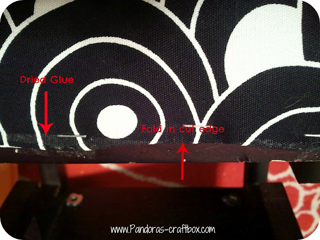 Second piece of advice make sure you fold in the edge of the fabric so you have a nice hold. If not you will need to take out the staples and do the hold thing all over again, like I did. I had already started gluing the trim when I figured out what I did wrong. The glue I used was fabric glue and it dries clear so it was not a big problem.